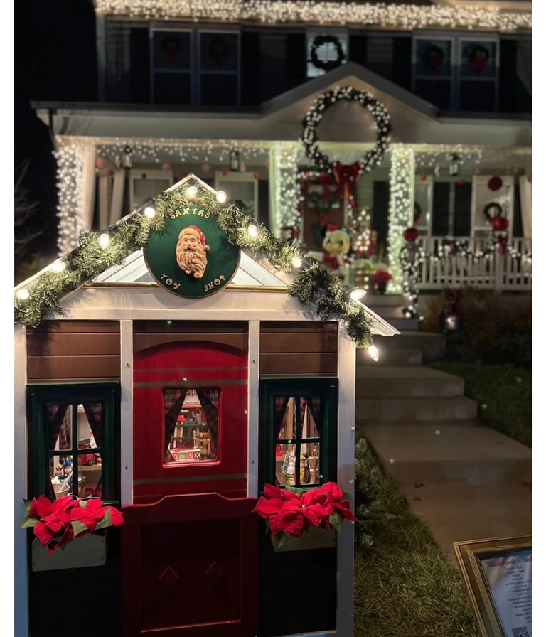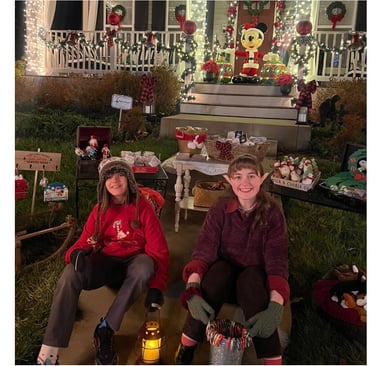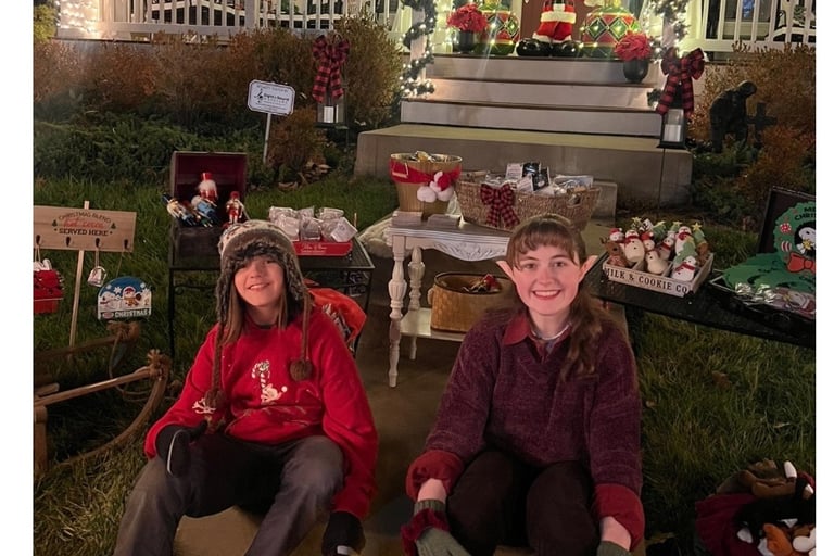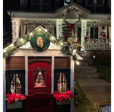 The next year, we added a new building. Santa's Toy Shop was Jordan's most ambitious and detailed build. He took a used playhouse and converted it into a full experience, complete with a scavenger hunt for visitors. He put so much thought into making this magical for anyone who passes by, but also a way to honor our losses. There are vintage toys, a real working animatronic, and a sleeping stuffed puppy keeping the elf company. But you'll also spot metal airplanes dangling from the ceiling; those belonged to my paternal grandfather, who was a pilot. And if you look closely in one of the windows, you'll see a nutcracker that was hand-painted to look like Charlie Brown, Grandma's favorite. Making space for those precious parts of my childhood did so much for my spirit in 2023. The giveaway night that year also did a lot to ease the grief we felt. Friends and neighbors gathered outside, kids played in the yard, and some came inside and stayed for hours. Christmas music rang out as families took pictures of their little ones' bright smiles as they ran through our village.